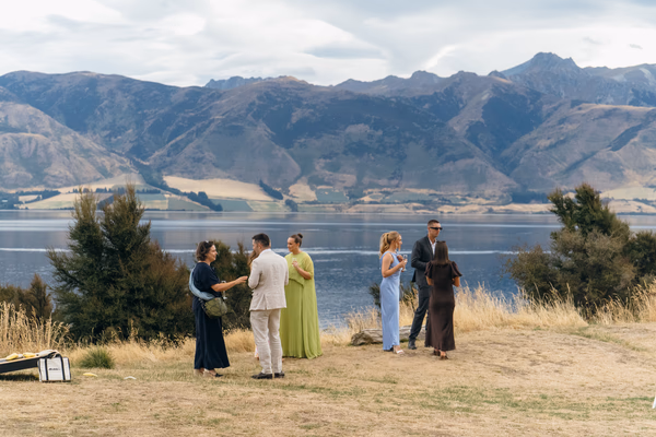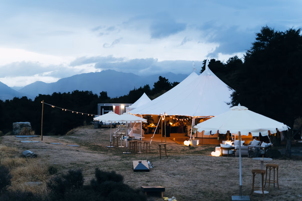Set beside the lake and surrounded by native bush, The Hide is a remote, marquee-only venue that comfortably hosts up to 120 guests. With views stretching across Lake Hāwea and a sculpted outdoor setting complete with rimu bar, stone dais and fireplace seating, it’s a memorable choice for a secluded celebration.